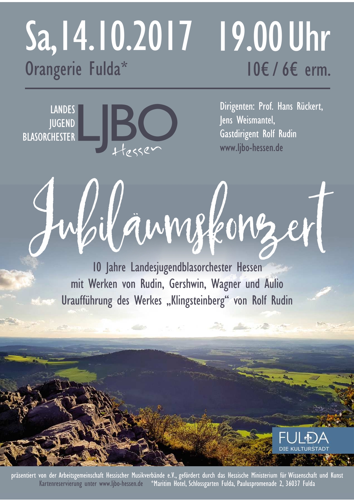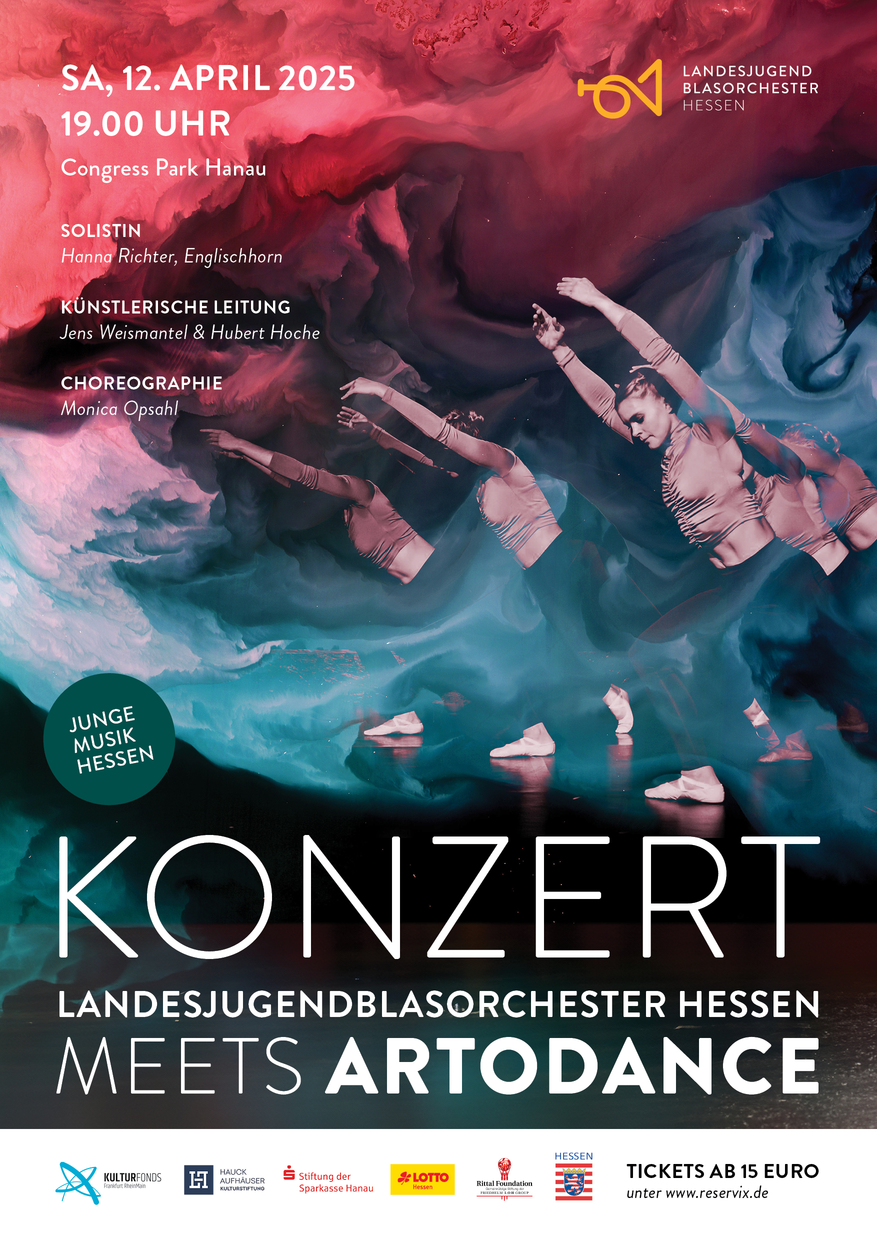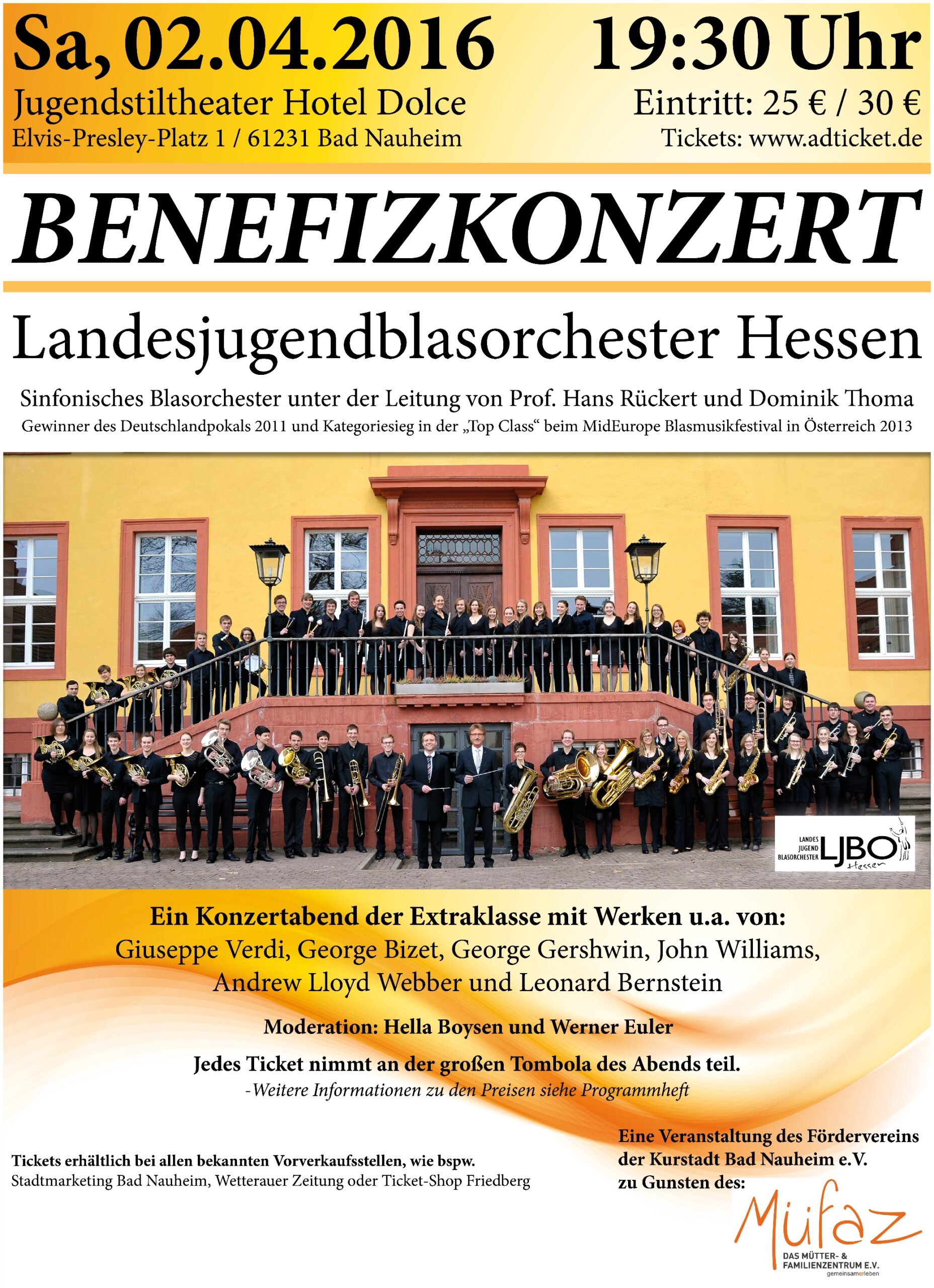 KonzertplakatProgrammMaurice Ravel (bearb. Johan de Meij)Pavane Pour une Infante DefunteBob Margolis (nach Michael Praetorius)TerpsichoreArturo Márquez (beab. Oliver Nickel)Danzón No. 2Leonard Bernstein (bearb. Paul Lavender)Symphonic Dances from West Side StoryLeonard Bernstein, bearb. Paul MurthaGee, Officer KrupkeLeonard Bernstein, bearb. Michael BrownAmerica- ProgrammGustav HolstSecond Suite in FAlfred ReedArmenian Dances (Part I)Hubert HocheMelancholy MomentJoseph SchwantnerIn evening's stillness...Rolf RudinAm Ende des TagesHubert HocheNelasgaHubert HocheIs it the endBob MargolisTerpsichore (nur Ausschnitte)