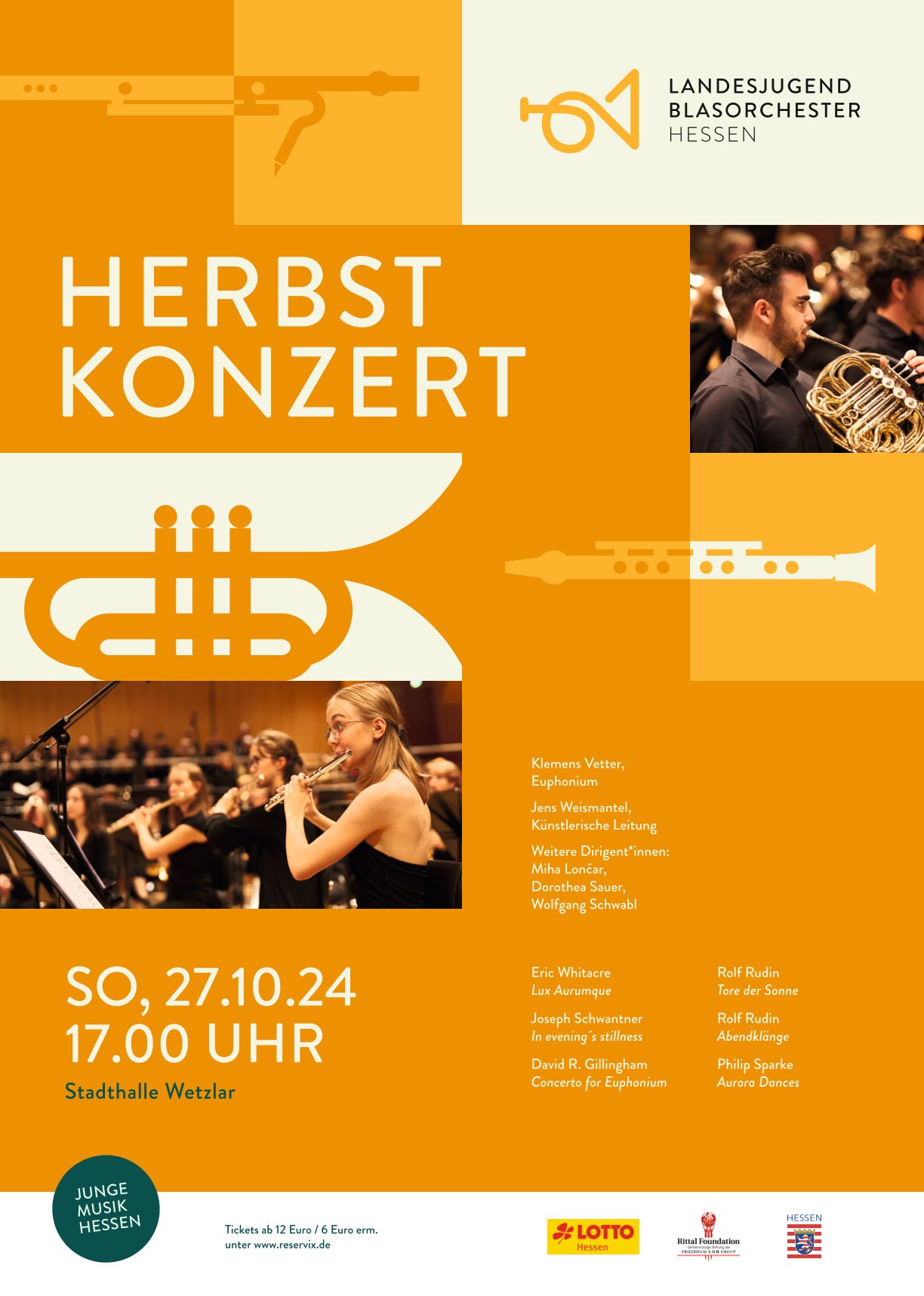 - ProgrammLux AurumqueEric WhitacreIn evening's stillness...Joseph SchwantnerConcerto for EuphoniumDavid R. GillinghamTore der SonneRolf RudinAbendklängeRolf RudinAurora DancesPhilip Sparke